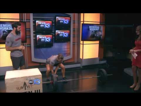 53-lb. single arm kettlebell thrusters, 14 reps (7 each arm)